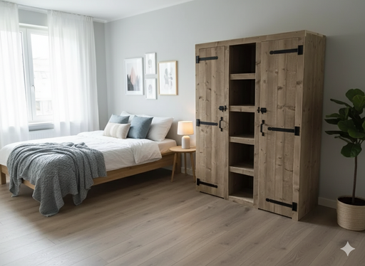 Beschrijving Steigerhouten kledingkast Athene Bepaal zelf de maatvoering Legplanken en/of hanggedeeltes Zwarte scharnieren en handgrepen Keuze ui...