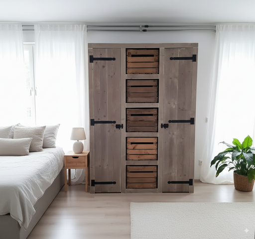 Steigerhouten kledingkast met fruitkistjes